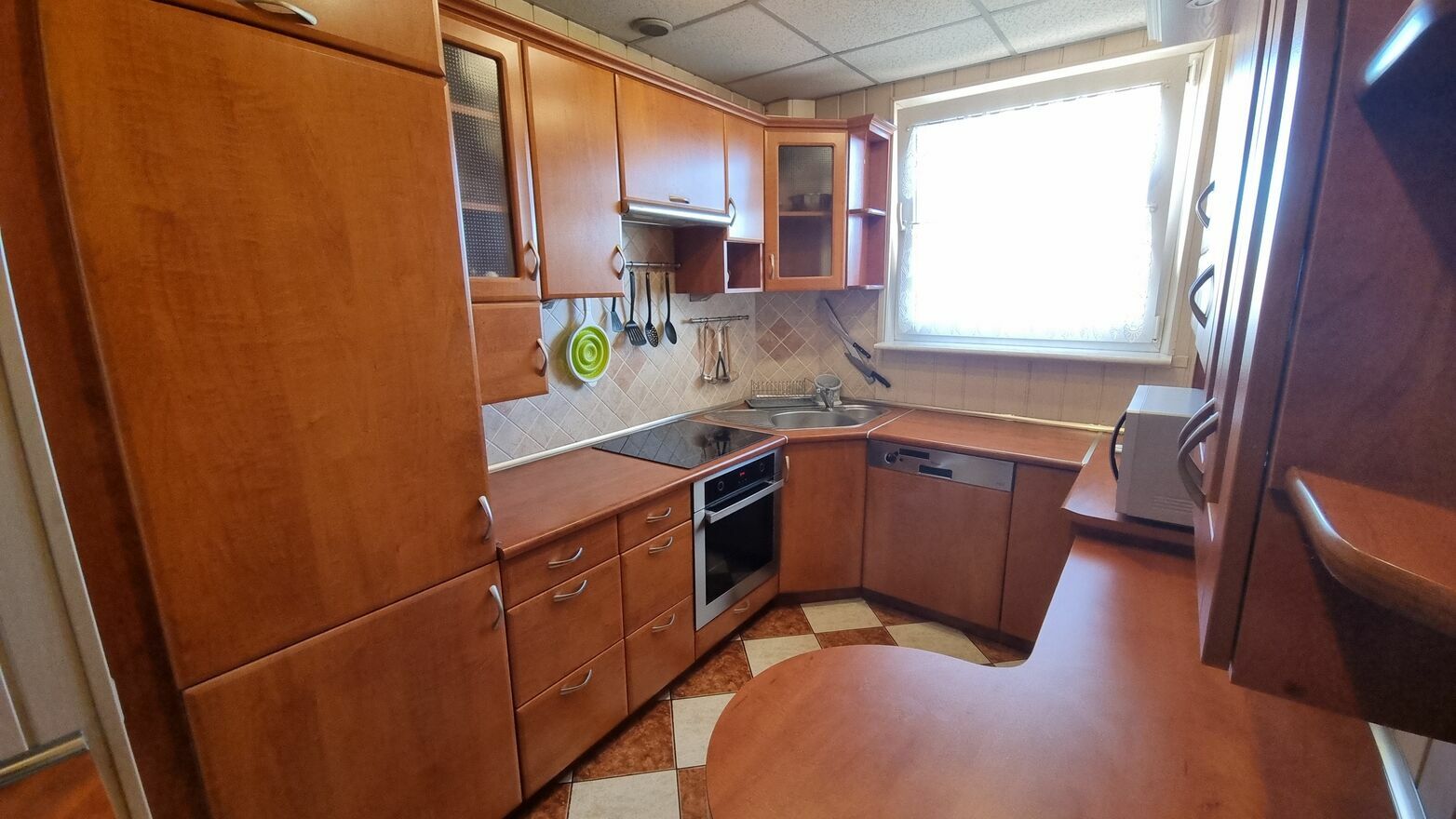 Kuchnia w pełni wyposażona w meble i sprzęt AGD w zabudowie (chłodziarko-zamrażarka, płyta indukcyjna, piekarnik, zmywarka, okap, dwukomorowy zlewozmywak).