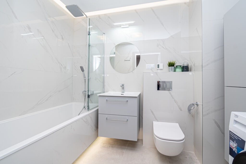 • nowoczesnej, estetycznej łazienki z pralką oraz grzejnikiem