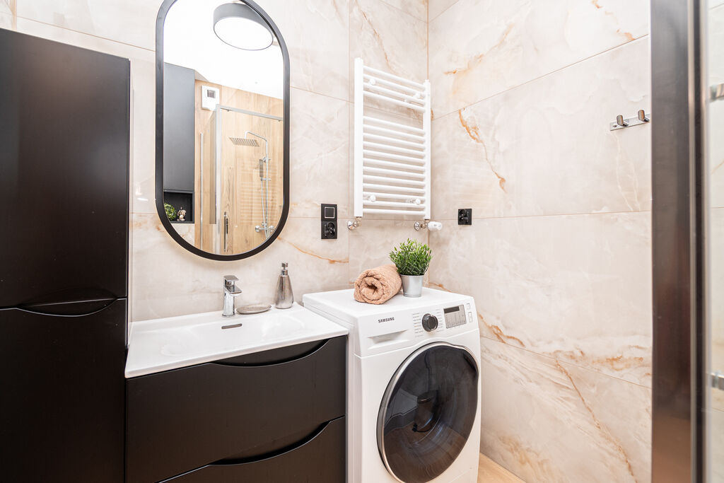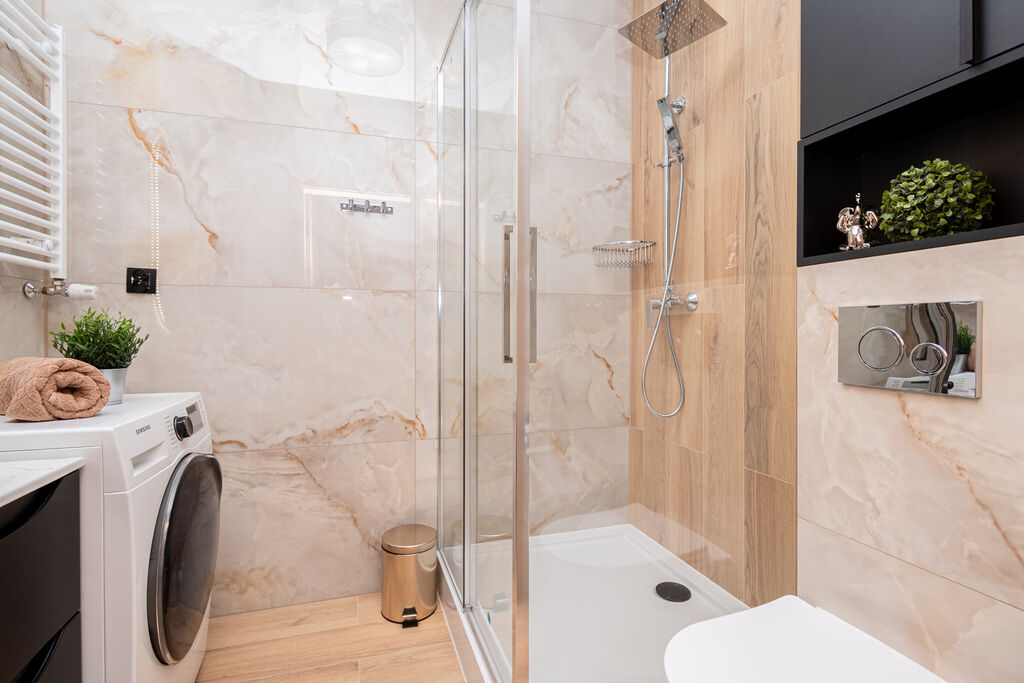 Łazienka z prysznicem i pralkąPrzedpokój z szafą