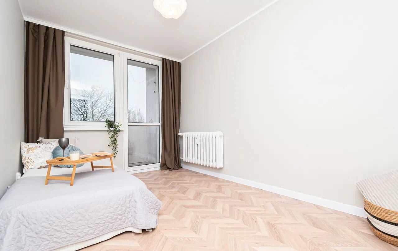 W salonie znajduje się nowa rozkładana kanapa, stół z krzesłami oraz wysoka szafa z wydzielonym miejscem na pralkę. W przedpokoju zamontowano pojemne szafki na obuwie. Sypialnia pozostaje do własnej aranżacji, co daje możliwość dopasowania wnętrza do indywidualnych potrzeb.