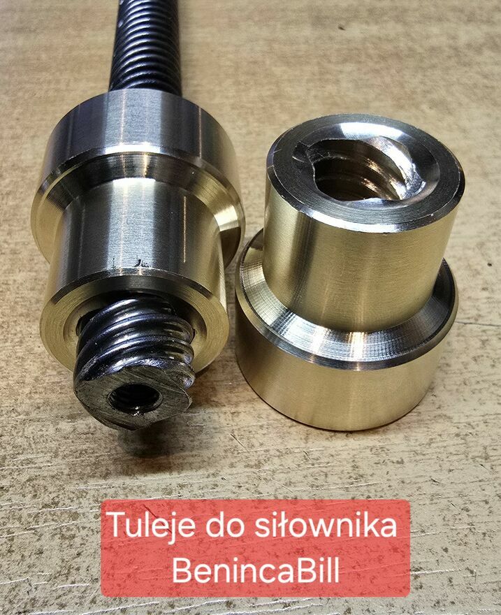 Śruba, tuleja z wewnętrznym gwintem trapezowym wykonana z mosiądzu i przeznaczona do regeneracji siłowników elektrycznych firmy Beninca BILL 30 40 50. Zdjęcia pokazują tuleje wykonane z mosiądzu naszej produkcji, jest to trwały zamiennik oryginalnej części plastikowej podatnej na uszkodzenia i szybkie zużycie. Sprzedaż dotyczy jednej sztuki niezależnie od długości siłownika.Oryginalna plastikowa tuleja napędowa to część która jest najsłabszym ogniwem w wymienionych wyżej drogich siłownikach z uwagi na szybkie zużywanie się podczas normalnej pracy. Jest najczęstszą przyczyną występowania awarii w siłownikach stosowanych w takich konstrukcjach jak: bramy, furtki, garaże i wiele innych. Wymiana plastikowej tulei na mosiężną wykonanej w naszej firmie PPHU SOLAR TRACKER precyzyjnie na maszynie cyfrowej CNC radykalnie poprawia niezawodność działania siłownika, wydłuża okres użytkowania jak również zwiększa siłę przenoszonego napędu.