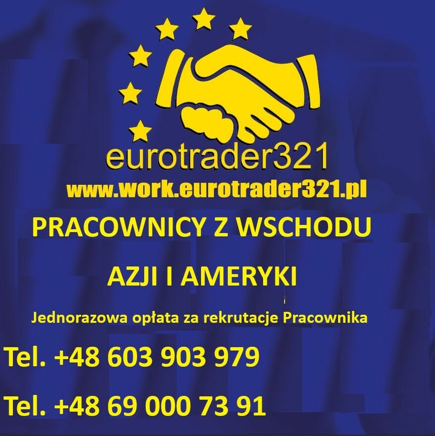 Eurotrader321 Kadrowe Biuro rekrutacyjne Specjalizuje się w wyszukiwaniu i rekrutacji pracowników z Wschodu i Azji oraz Ameryki ŁacińskiejJednorazowa opłata za rekrutacje po miesięcznym bezpłatnym okresie próbnym okres gwarancji na rekrutacje za pracownika 9 miesięcy