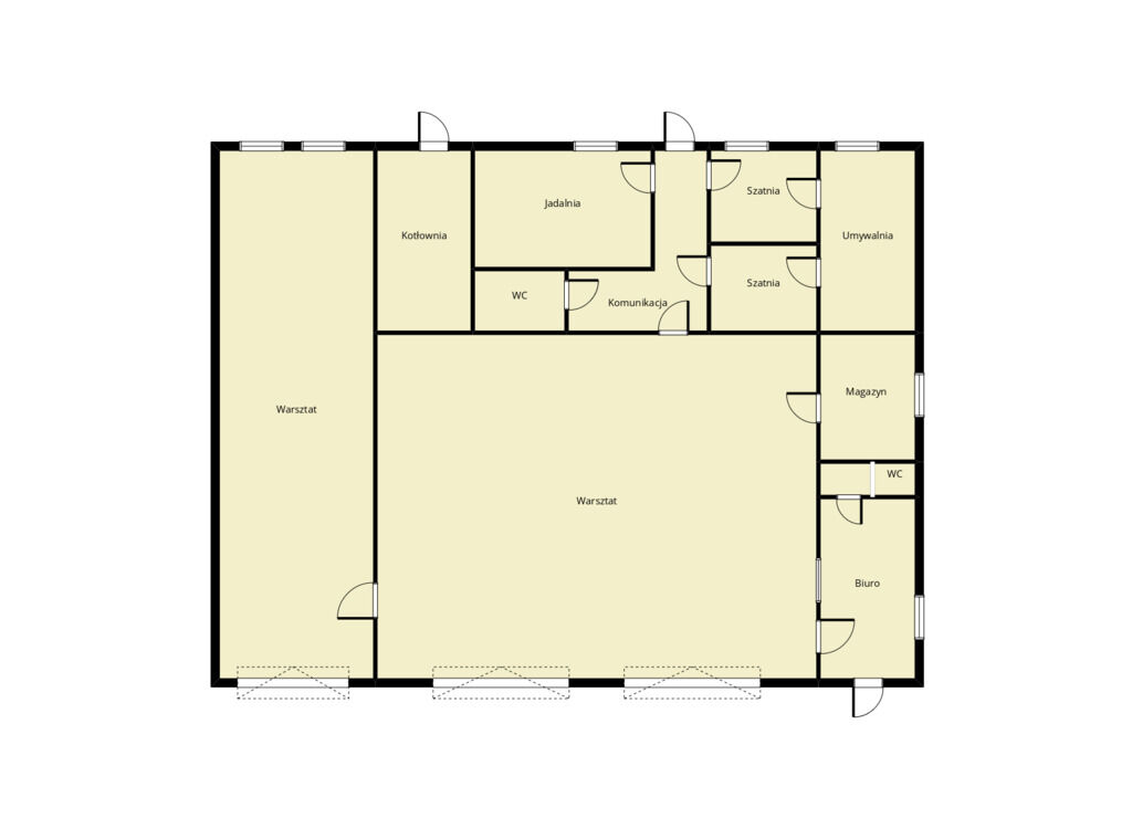 Układ pomieszczeń: 2 hale warsztatowe z 3 bramami garażowymi