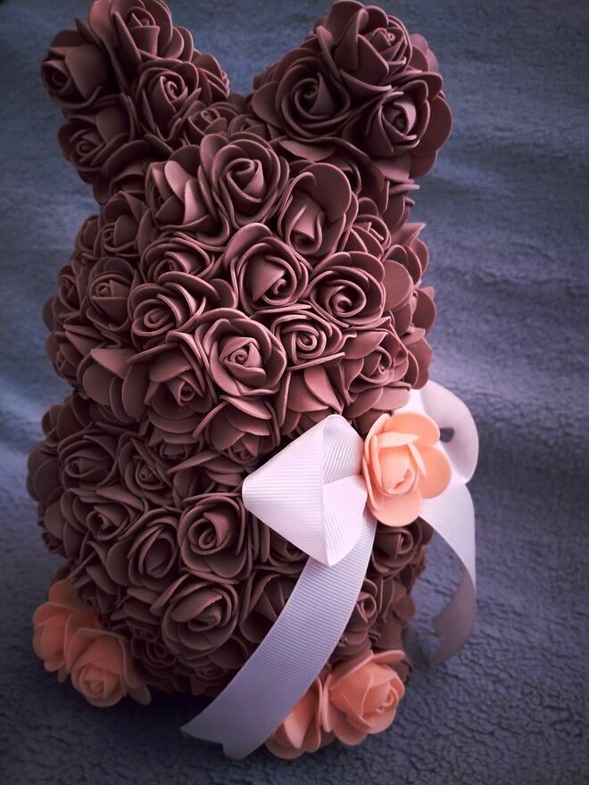 Zajączek ozdobiony różyczkami piankowymi, wys. ok. 27 cm.Piękna ozdoba na Wielkanoc.