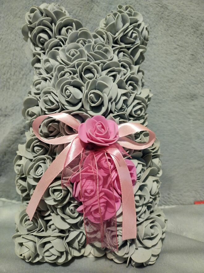 Zajączek ozdobiony różyczkami piankowymi, wys. ok. 27 cm.Piękna ozdoba na Wielkanoc.